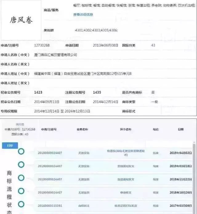 从中国商标网查询得知,“唐风卷”最早是在2013年6月8日由厦门唐品汇餐饮管理有限公司提出商标注册申请,所属国际分类为第43类餐饮类,于次年12月核准注册成功。同时,唐品汇还将“唐风卷”商标注册到了21类、09类、16类、35类等多个类别。
